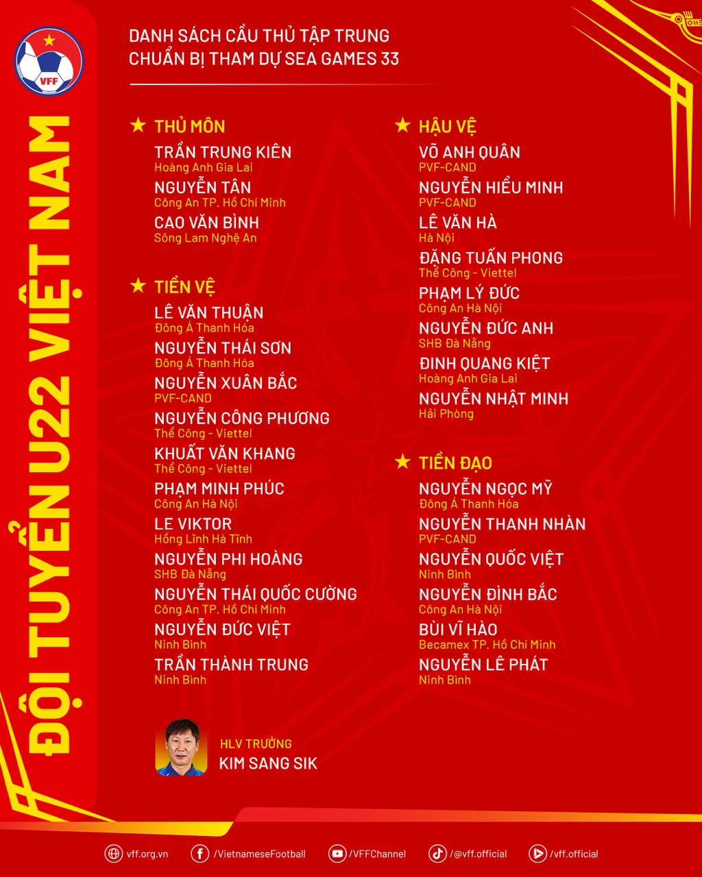 BDVN.TV Ngày 21/11, HLV Kim Sang-sik công bố danh sách 28 cầu thủ cho đợt tập trung cuối cùng hướng đến SEA Games 33, trong đó Việt kiều Trần Thành Trung là một trong 3 cầu thủ được gọi bổ sung.