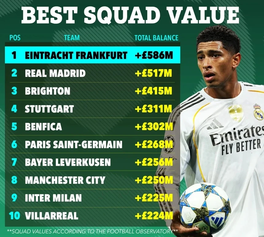 Ở chiều ngược lại, bức tranh sáng hơn thuộc về các đội giàu chiến lược chuyển nhượng. Eintracht Frankfurt dẫn đầu thế giới với giá trị ở mức dương 586 triệu bảng, nhờ chính sách mua rẻ – bán đắt và đội hình hiện tại được định giá cao.