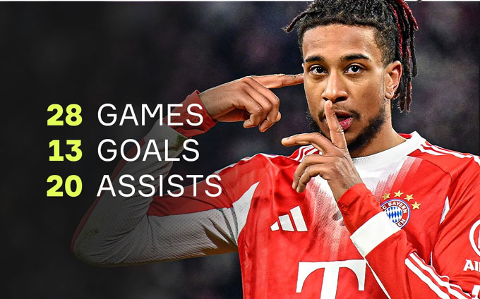 Tổng cộng, Olise đã có 13 bàn và 20 kiến tạo sau 28 trận cho Bayern ở mùa giải này. Anh đang cùng với Harry Kane và Luis Diaz tạo nên hàng công khủng bố bậc nhất châu Âu.
