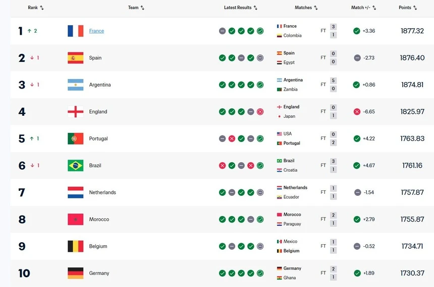 Pháp vượt qua Đội tuyển Tây Ban Nha – đội tuyển đã giữ vị trí số 1 từ tháng 9/2025 – nhờ chuỗi kết quả ấn tượng trước các đối thủ mạnh.