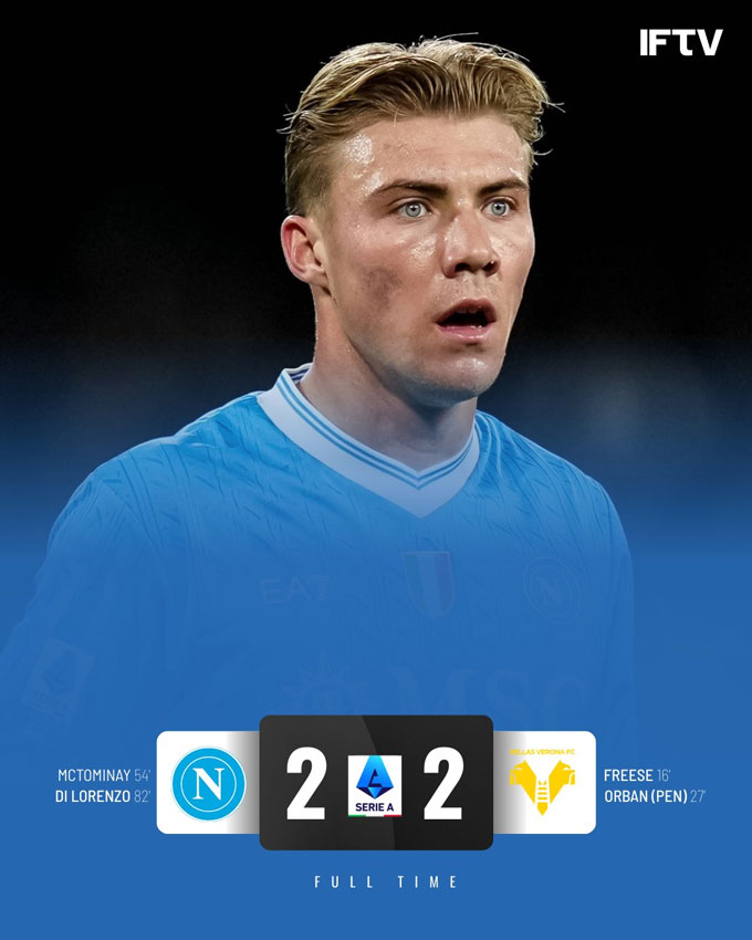 Phải tới phút 54, Napoli mới có bàn rút ngắn cách biệt nhờ công của Scott McTominay. Tới phút 72, Hojlund đã đưa được bóng vào lưới của Verona nhưng bàn thắng không được công nhận bởi VAR.