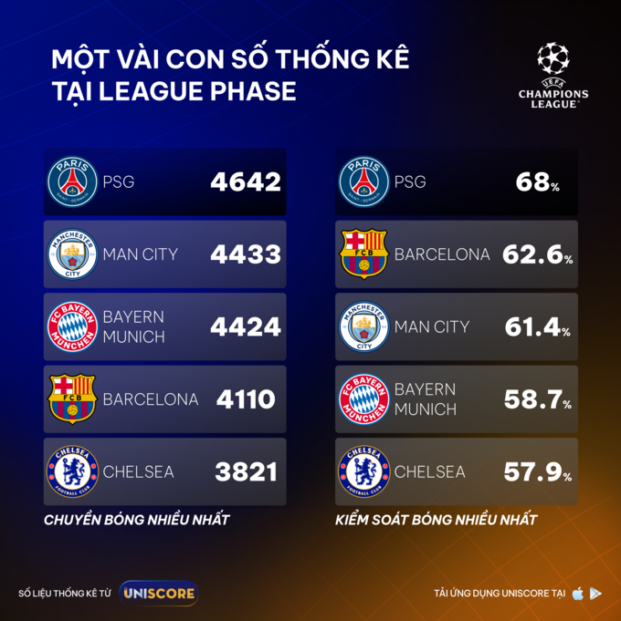 Về cá nhân, Vitinha (PSG) đang dẫn đầu giải với 745 đường chuyền, vượt xa Aleksandar Pavlović (Bayern) và Joshua Kimmich. Theo dữ liệu được cung cấp bởi trang tỷ số trực tuyến Uniscore, PSG cũng là đội có tỷ lệ kiểm soát bóng trung bình cao nhất, xấp xỉ 68%, theo sau là Barcelona và Man City.