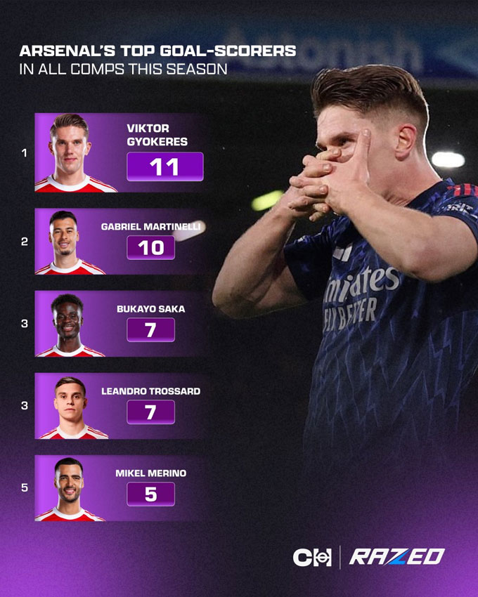 Tính trên mọi đấu trường, Gyokeres cũng đang là cây săn bàn số 1 của Arsenal với 11 lần lập công. Đứng sau anh là Martinelli (10 bàn), Saka và Trossard (cùng 7 bàn), Merino (5 bàn).
