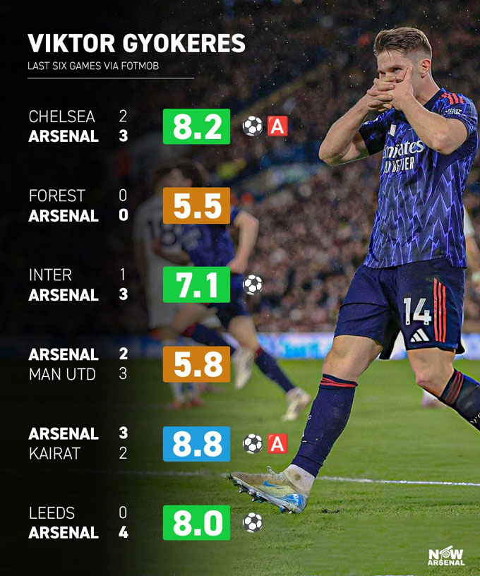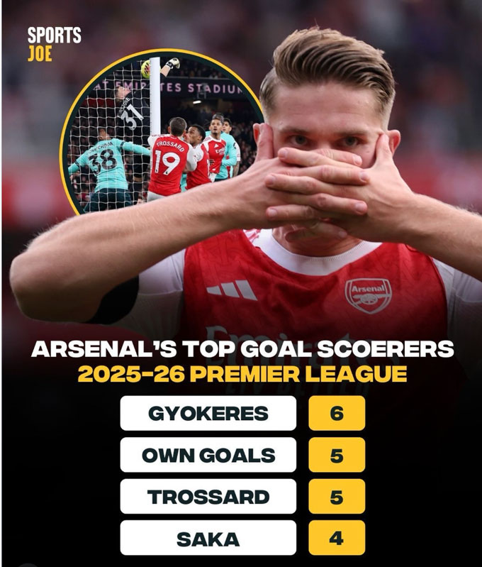 Hình ảnh Gyokeres rướn người dứt điểm đầy quyết tâm ở trận thắng Leeds giúp anh dẫn đầu cuộc đua Vua phá lưới nội bộ của Arsenal hiện tại, với 6 bàn tại Premier League. Đứng sau là số bàn phản lưới nhà (5 bàn) cùng với 4 cầu thủ khác là Rice, Saka, Merino và Eze (cùng 4 bàn).